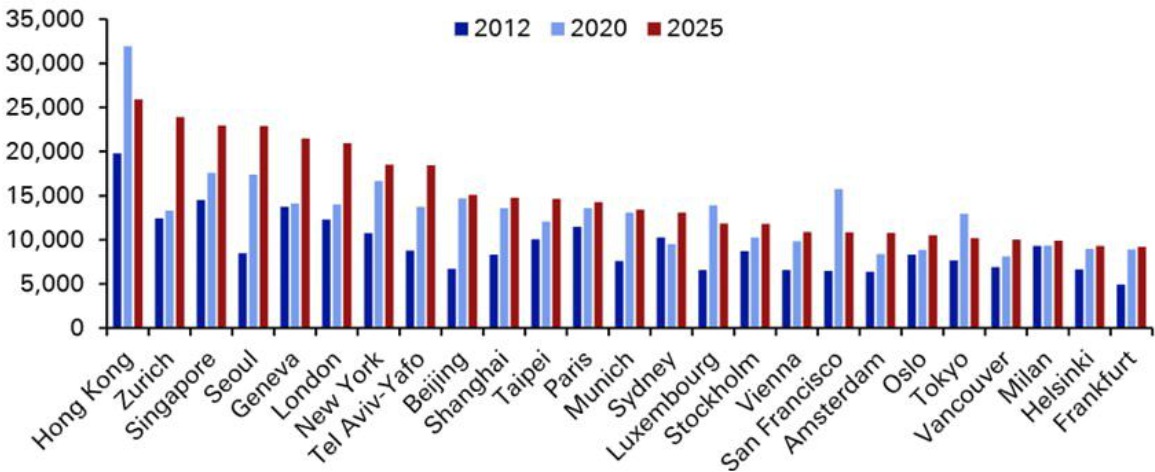 ובכן, מה ראו בדויטשה בנק והאם התוצאות מפתיעות? במקום הראשון, באופן לא מפתיע, נמצאת הונג קונג, שם המחיר מגיע ל-25 אלף דולר למ"ר. המחיר עדיין גבוה למרות שהמחירים שם צנחו בצורה משמעותית (לפני 5 שנים המחיר היה קרוב ל-33 אלף דולר).