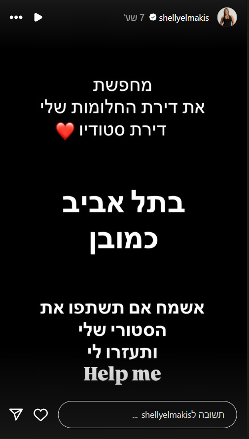 כזכור בזמנו היא כתבה: "אני מחפשת את דירת החלומות שלי, דירת סטודיו בתל אביב כמובן. אשמח אם תשתפו את הסטורי שלי ותעזרו לי", כך כתבה יוצאת "האח הגדול" למעריציה ברשת החברתית אינסטגרם.