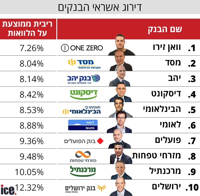 אז מה מצאנו? שהבנק שגובה את הריבית הנמוכה ביותר הוא וואן זירו. הבנק שגובה את הריבית הגבוהה ביותר הוא בנק ירושלים - בדיוק כמו בחודשיים הקודמים. בנק ירושלים גובה 12.32% ריבית בעוד שוואן זירו גובה ריבית ממוצעת של 7.26%. הממוצע, כאמור, הוא 9.26% והבנקים שגובים יותר ממנו הם פועלים, מזרחי טפחות, מרכנתיל וכאמור - בנק ירושלים - ובפער ניכר ממתחריו.