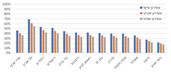 תראו מה קורה בתל אביב. ההחזר החודשי מסך ההכנסה לפי ערים (נתונים: מכון אלרוב)