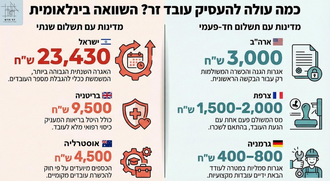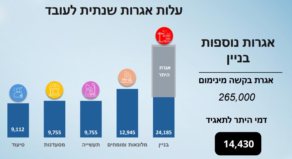 העלות שעליה מדברים בענף, כ־24 אלף שקל בשנה לעובד, אינה אגרה בודדת, אלא שילוב של שלושה תשלומים שונים: אגרת בקשה: 1,060 שקל; אגרה שנתית בענף הבניין: 8,490 שקל; ובעיקר דמי היתר (ייחודיים לענף הבניין בלבד): 14,430 שקל. בנוסף, נדרשות ערבויות לעובד של כ-10,000 שקל.