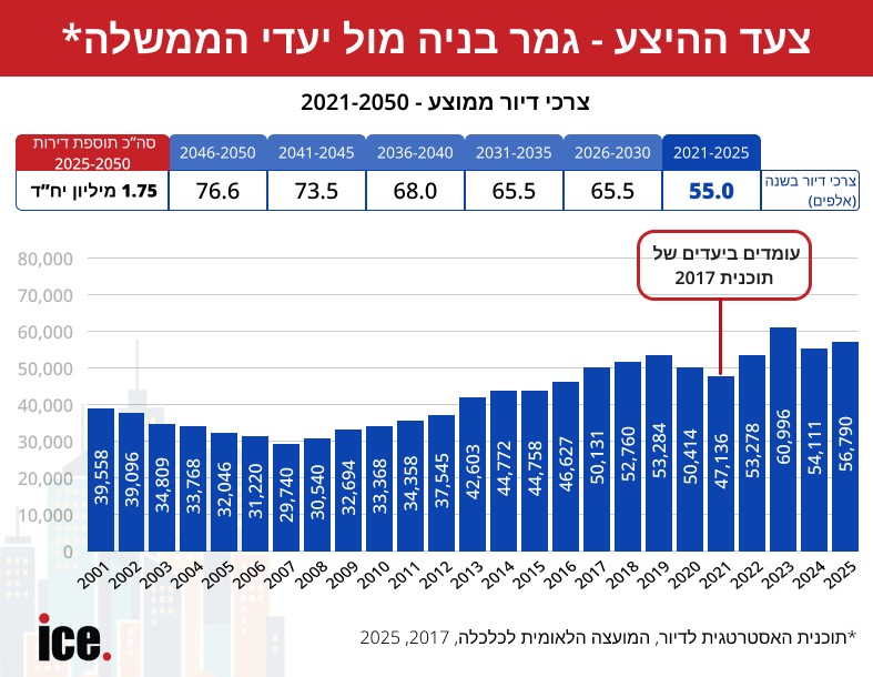 כפי שפורסם השבוע, לפי התכנית האסטרטגית לדיור, החל משנת 2026 ישראל תצטרך להגדיל משמעותית את הבנייה בעוד 10,000 דירות לפחות כדי לעמוד בביקושים. החל מהשנה, ישראל עמדה ביעד לבניית 50-55 אלף דירות בשנה. חשוב לציין כי מדובר בנתוני גמר בנייה, ולא בהתחלות הבנייה.