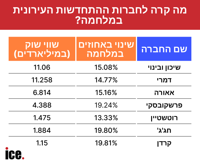 לקחנו את החברות שרשמו שינוי דו ספרתי מאז תחילת המלחמה ושם אפשר למצוא את קרדן וחג'ג', שעלו בשיעור של 19.8%. רבים בוודאי יגידו שחלק מהחברות ברשימה אינן חברות התחדשות עירונית במהותן. זה נכון, אבל היום - חברות רבות משלבות אחוזים מסוימים בשוק מתוך כוונה להגדיל את האחיזה בשנים הקרובות. הן יודעיות שללא זרוע התחדשות עירונית, ואולי גם ללא זרוע ביצועית, ספק אם תהיה להן זכות קיום בעתיד.