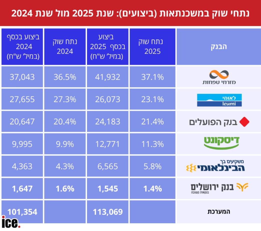 השאלה הגדולה היא מי הבנק המוביל במשכנתאות בישראל ומה נתח השוק שלו? מנתונים שהגיעו ל-ice ומסכמים את נתח השוק של הבנקים השונים לשנת 2025 לעומת שנת 2024, עולה כי מזרחי טפחות של משה לארי מחזיק בנתח השוק הגדול ביותר, 37.1%. הבנק הגדיל את אחיזתו בשוק המשכנתאות, אחרי שבשנת 2024 נתח השוק שלו עמד על 36.5%.