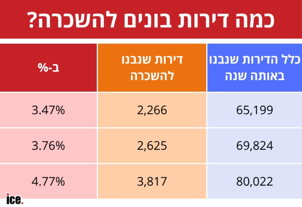 כפי שתוכלו לראות בטבלה, במהלך השנתיים האלה נוספו עוד כ-1,500 דירות לבנייה. אם ניקח בניין ממוצע, סביר להניח שמדובר בכ-45 בניינים חדשים בישראל שמיועדים לשכירות ארוכת טווח. ייתכן ושיעור הבניינים החדשים נמוך יותר, בשל העובדה שבניינים להשכרה לרוב גבוהים יותר, אבל מה שמעניין הוא מספר הדירות. עלייה של 1,500 דירות נותנת מענה לעוד 500 משפחות בממוצע בישראל. זה עדיין לא הרבה, אבל מדובר בגידול לעומת שנים עברו גם באחוזים. כיום, כך עולה מהניתוח, קרוב ל-5% מהדירות שנבנות הן לטובת שכירות.