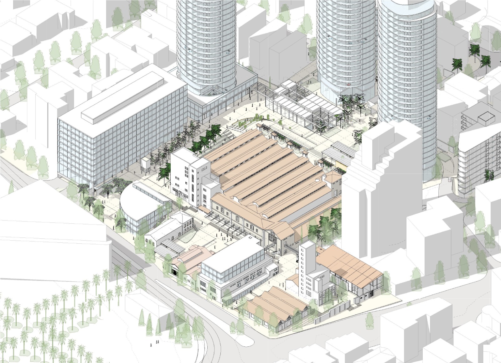 בנוסף, התוכנית כוללת מגדל של עד 30 קומות שישלב דיור מוגן ומבני ציבור, מבנה של 9 קומות שישמש לתעסוקה, מבנה של 3 קומות לשטחי ציבור על רחוב הכרמל. סה"כ בתוכנית כ-21,150 מ"ר עבור שטחי תעסוקה, כ-19,400 מ"ר עבור שטחי מסחר ו-7,100 מ"ר שטחי ציבור. המבנים במתחם לשימור ישמשו למסחר ותעסוקה.