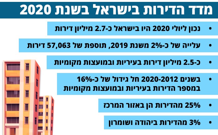 הלשכה המרכזית לסטטיסטיקה פרסמה את מדד הדירות והמבנים בישראל בשנת 2020. על פי הנתונים, באמצע שנת 2020 היו בישראל כ-2.7 מיליון דירות למגורים, עלייה של כ-2% מאשתקד