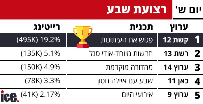 בקשת 12 נרשם למשדר בשעות הללו נתון של 16.5% לצד 414 אלף צופים, כאשר ברשת 13 השיגו 5.9% עם 166 אלף צופים, בכאן 11 הסתפקו ב-3.5% לצד 82 אלף צופים במשדר בשעות הללו.