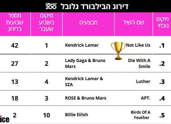 למעלה משבועיים אחרי הופעתו הבלתי נשכחת בסופרבול, הראפר קנדריק לאמאר ממשיך למנף את ההצלחה שלו עם נוכחות מרשימה בדירוג. במקביל, אחרי שבמשך תקופה הוביל את הטבלה, ברונו מארס מאבד גובה | דירוג הבילבורד 200 גלובל