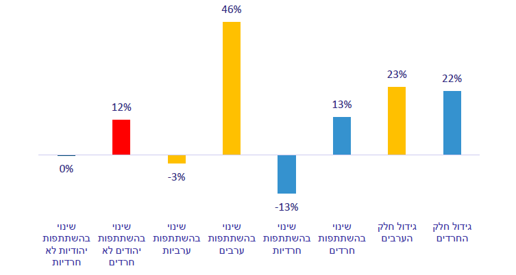 הגידול המשמעותי בחלקן של האוכלוסייה הערבית והחרדית מהווה חלק משמעותי מהירידה הכללית. אוכלוסיות אלו מציגות שיעורי השתתפות נמוכים בשוק העבודה באופן כללי. ככל שחלקן באוכלוסייה הצעירה גדל, כך נחלש שוק העבודה הכללי. "הגידול בחלקם של קבוצות המאופיינות בשיעורי השתתפות נמוכים הוא גורם מרכזי בירידה בשיעור ההשתתפות של קבוצות הגיל הצעירות; תהליך זה, ובעיקר העלייה בחלק היחסי של חרדים, צפוי להאיץ בשנים ובעשורים הקרובים", נכתב בדוח.