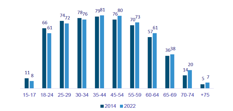 שיעור ההשתתפות של צעירים בגילאי 18-34 ירד ב-5 נקודות אחוז בין השנים 2014 ל-2022. הדבר בלט במיוחד בקרב גברים ערבים, ששיעור ההשתתפות שלהם ירד ב-8%, וגברים חרדים, עם ירידה של 6%. אצל הנשים, כולל חרדיות וערביות, נרשמה דווקא עלייה בשיעור ההשתתפות.