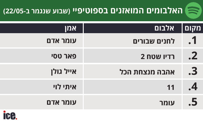 שמו של עומר אדם מתנוסס דרך קבע בפסגת האמנים המואזנים ביותר בדירוג הספוטיפיי הישראלי, וגם השבוע זכה האומן לשאוף אוויר פסגות. השינויים ברשימה נרשמו רק במיקומים הפנימיים, ולא בשמות. את המקום השני קטף אייל גולן, ואת המקום השלישי קיבלה אודיה, שהחליפו ביניהם מקומות מהדירוג האחרון.