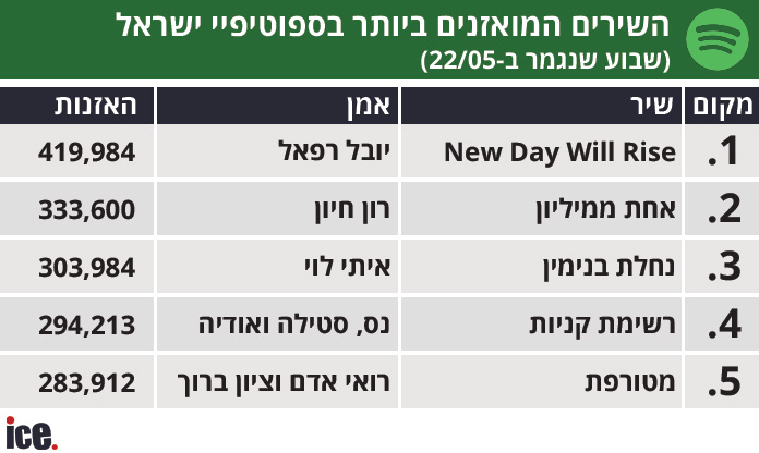 אחר ההישג המרשים והמעורר השראה של יובל רפאל בגמר האירוויזיון בו הגיעה למקום השני, הישראלים עדיין מתענגים על השיר שיצג אותנו בכבוד "New Day Will Rise", שזכה ל-419,984 האזנות ולמקום הראשון. הראפר העולה רון חיון ירד מהמקום הראשון לשני מנגד, ושירו "אחת ממיליון" זכה ל-333,600 האזנות. את השלישייה הראשונה סגר איתי לוי עם "נחלת בנימין" ו-303,984 האזנות.