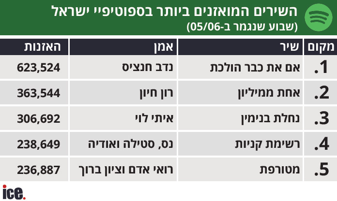 עם זאת, השיר האהוב על הישראלים בשבוע החולף בספוטיפיי המשיך להיות "אם את כבר הולכת" של נדב חנצ'יס, שהגיע ל-623,524 האזנות. "אחת ממיליון" של אמן צעיר נוסף - רון חיון - גרף 363,544 האזנות וסיים במקום השני. איתי לוי עם "נחלת בנימין" סיכם את השבוע במקום השלישי ורשם 306,692 האזנות.