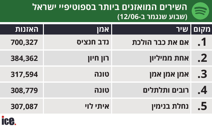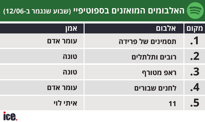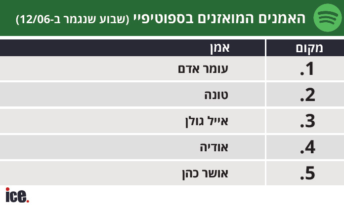 התקיפה באיראן בלילה בין חמישי לשישי שינתה את המציאות בה אנו חיים. אם בשבוע הבא נצפה לראות שירי מלחמה ומוטיבציה, כעת אנחנו עדיין מתנחמים בעבר. בדירוג הספוטיפיי השבועי של ice, עומר אדם חזר לצמרת האמנים המואזנים, לאחר שטונה הצליח להחזיק בה שבוע אחד בלבד.