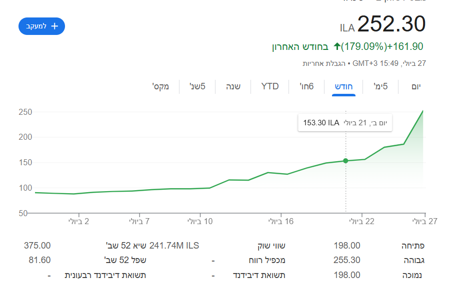 ביממה האחרונה נרשמה קפיצה אדירה של 35.35% בדרך לשער של 2.52 שקל למניה. בשבוע האחרון המניה קפצה ביותר מ-60% אבל המספר המטורף באמת הוא החודש האחרון בו המנייה זינקה ב-179% בסך הכל. התקופה הזו קצת מאוששת את המניה שדווקא הייתה בירידה קשה בשנים האחרונות כשבראייה של 5 שנים היא דווקא צנחה ב-82%.