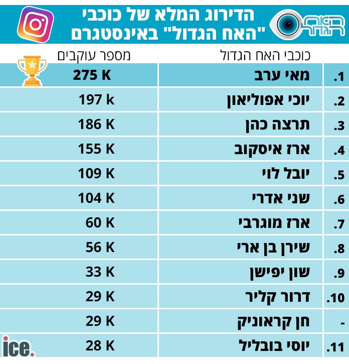 למרות שתרצה כהן, הדיירת הפייבוריטית לזכייה נמצאת גבוה בטבלת העוקבים, היא לא כבשה את המקום הראשון. דווקא מאי ערב, אותה מתמודדת שעוררה סערה בעקבות ההשתמטות שלה מצה"ל, היא זו שהצליחה להגיע לפסגת הטבלה עם 275 אלף עוקבים.