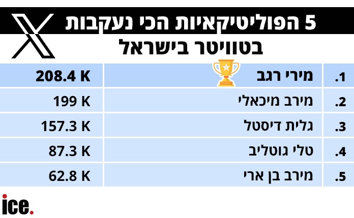 במקום הראשון, ניחשתם נכון, ממוקמת מירי רגב מהליכוד - עם 208.4K עוקבים, רגב היא בטופ הפוליטיקאיות הכי נעקבות ברשת X. במקום השני - מירב מיכאלי מהעבודה, פוליטיקאית מוכרת שעלתה אל מעט פעמים לכותרות כשרה וחברת כנסת.