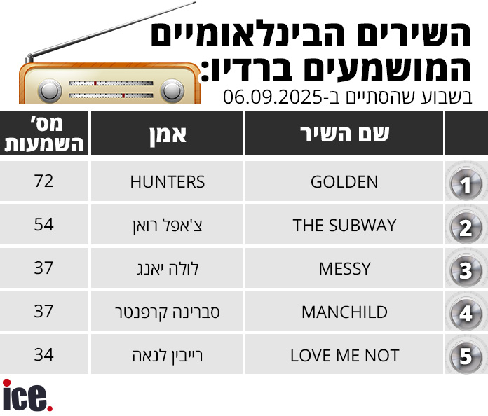 דירוג תחנות הרדיו של ice מסכם את השבוע שחלף. אייל גולן ממשיך להיות הזמר המושמע ביותר בתחנות הרדיו עם לא פחות מ-541 השמעות. במקום השני נמצא עומר אדם עם 439 השמעות, אודיה במקום השלישי עם 436 השמעות. את החמישייה הראשונה סוגרים שרית חדד ופאר טסי עם 422 ו-390 השמעות בהתאמה.