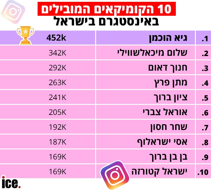למרבה ההפתעה, לא. מי שכבש את המקום הראשון ברשימה הוא דווקא כוכב הרשת והקומיקאי גיא הוכמן. עם 452K עוקבים. מיד אחריו השחקן והקומיקאי שלום מיכאלשווילי עם 342K, שבקיץ כיכב בשובר הקופות (לשחרר את שולי סאן, הסרט שעשה מיליון שקל בחודש) לצד חבריו הקומיקאים ציון ברוך ואסי ישראלוף, גם הם נכנסו לרשימת 10 הקומיקאים המובילים בישראל.