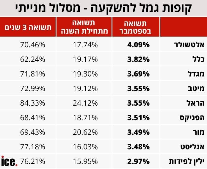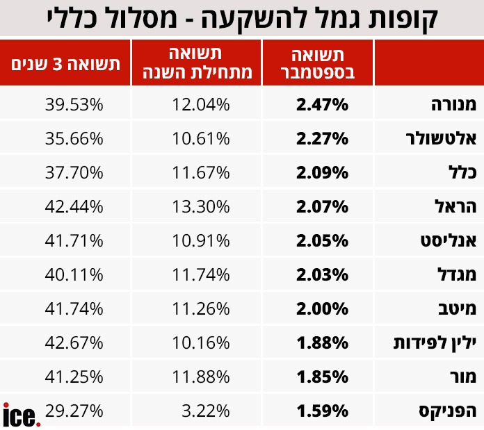 בדומה לקרנות ההשתלמות, גם קופות הגמל להשקעה במסלול הכללי הציגו תשואה של עד 2.4%-2.5% בספטמבר. מי שהובילה את הטבלה בקופות הגמל היא מנורה שהציגה תשואה של 2.47%.
