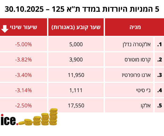 את רשימת המניות היורדות של היום מובילה אלקטרה נדלן שירדה בשיעור של 5% לרמה של 5,000 נקודות. במקום השני נמצאת קרסו מוטורס שירדה בשיעור של 3.82% לרמה של 3,900 נקודות. ארגו פרופרטיז במקום השלישי עם ירידה של 3.40% לרמה של 11,950 נקודות. מי שסוגרות את החמישייה המובילה הן ג'י סיטי שירדה בשיעור של 3.14% לרמה של 1,111 נקודות ואלקו שירדה בשיעור של 2.50% לרמה של 17,550 נקודות.