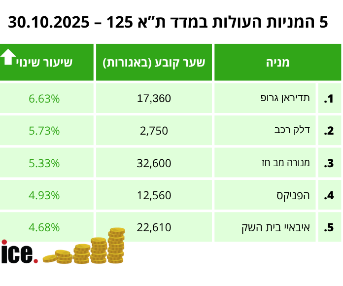 בקרב המניות העולות של היום: מי שמובילה את הרשימה היא תדיראן גרופ שעלתה בשיעור של 6.63% לרמה של 17,360 נקודות. במקום השני נמצאת דלק רכב שעלתה בשיעור של 5.73% לרמה של 2,750 נקודות. מנורה מב חז במקום השלישי לאחר שעלתה בשיעור של 5.33% לרמה של 32,600 נקודות. מי שסוגרות את החמישייה הראשונה הן הפניקס עם עלייה של 4.93% לרמה של 12,560 נקודות ואיבאיי בית השק שעלתה בשיעור של 4.68% לרמה של 22,610 נקודות.