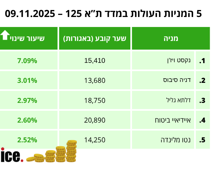 את רשימת המניות העולות של היום פותחת נקסט ויז'ן שעלתה בשיעור של 7.09% לרמה של 15,410 נקודות. במקום השני דניה סיבוס שעלתה בשיעור של 3.01% לרמה של 13,680 נקודות. מי שנמצאת במקום השלישי היא דלתא גליל שעלתה בשיעור של 2.97% לרמה של 18,750 נקודות. במקום הרביעי נמצאת איידיאיי ביטוח שעלתה בשיעור של 2.60% לרמה של 20,890 נקודות. את החמישייה סוגרת נטו מלינדה שעלתה בשיעור של 2.52% לרמה של 14,250 נקודות.