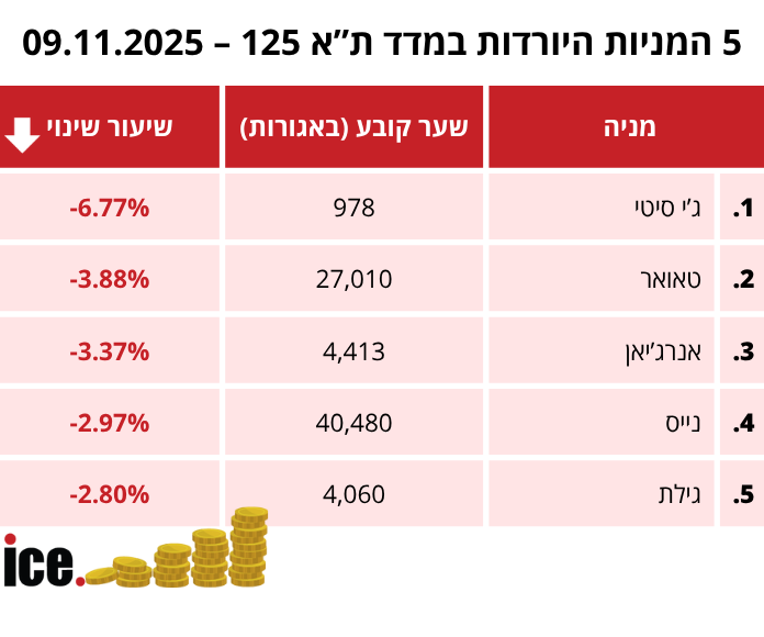 את רשימת המניות היורדות של היום מובילה ג'י סיטי לאחר שירדה בשיעור של 6.77% לרמה של 978 נקודות. טאואר במקום השני לאחר שירדה בשיעור של 3.88% לרמה של 27,010 נקודות. במקום השלישי אנרג'יאן לאחר שירדה בשיעור של 3.37% לרמה של 4,413 נקודות. נייס מחזיקה במקום הרביעי לאחר ירידה של 2.97% לרמה של 40,480. גילת סוגרת את החמישייה עם ירידה בשיעור של 2.80% לרמה של 4,060 נקודות.