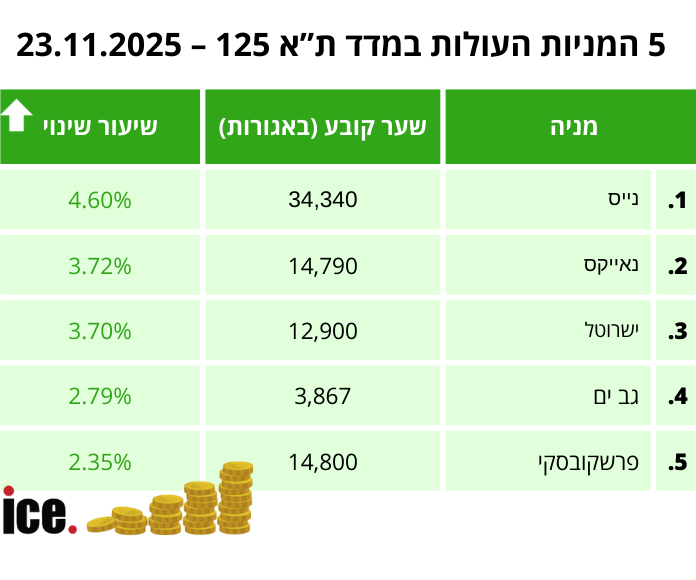 את רשימת המניות העולות מובילה נייס עם עלייה בשיעור של 4.60% לרמה של 34,340 נקודות. במקום השני ניצבת נאייקס עם עלייה של 3.72% לרמה של 14,790 נקודות. ישרוטל במקום השלישי עם עלייה של 3.70% לרמה של 12,900 נקודות. גב ים מחזיקה במקום הרביעי לאחר שעלתה בשיעור של 2.79% לרמה של 3,867 נקודות. פרשקובסקי סוגרת את החמישייה הראשונה עם עלייה של 2.35% לרמה של 14,800 נקודות.