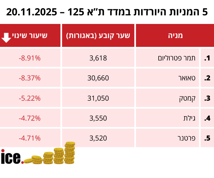 את רשימת המניות היורדות פותחת תמר פטרוליום שירדה בשיעור של 8.91% לרמה של 3,618 נקודות. במקום השני נמצאת טאואר שירדה בשיעור של 8.37% לרמה של 30,660 נקודות. קמטק במקום השלישי לאחר שירדה בשיעור של 5.22% לרמה של 31,050 נקודות. גילת במקום הרביעי לאחר שירדה בשיעור של 4.72% לרמה של 3,550 נקודות. את החמישייה סוגרת פרטנר עם ירידה של 4.71% לרמה של 3,520 נקודות.
