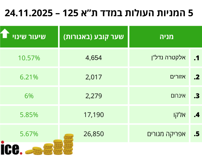 את רשימת המניות העולות של היום מובילה אלקטרה נדל"ן שטיפסה ב-10.54% לרמה של 4,654 נקודות. במקום השני נמצאת אזורים שעלתה בשיעור של 6.21% לרמה של 2,017 נקודות. אינרום במקום השלישי עם עלייה של 6% לרמה של 2,279 נקודות. אלקו רביעית לאחר שעלתה בשיעור של 5.85% לרמה של 17,190 נקודות. את החמישייה הראשונה סוגרת אפריקה מגורים עם עלייה בשיעור של 5.67% לרמה של 26,850 נקודות.