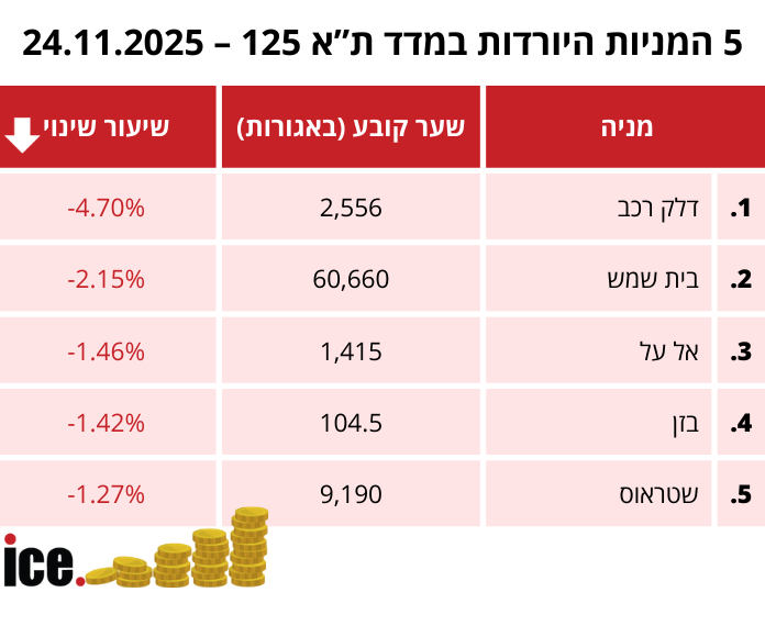 את רשימת המניות היורדות של היום פותחת דלק רכב עם ירידה בשיעור של 4.70% לרמה של 2,556 נקודות. במקום השני נמצאת בית שמש שירדה בשיעור של 2.15% לרמה של 60,660 נקודות. אל על במקום השלישי לאחר שירדה בשיעור של 1.46% לרמה של 1,415 נקודות. בזן רביעית עם ירידה של 1.42% לרמה של 104.5 נקודות. את הרשימה סוגרת שטראוס לאחר שירדה בשיעור של 1.27% לרמה של 9,190 נקודות.