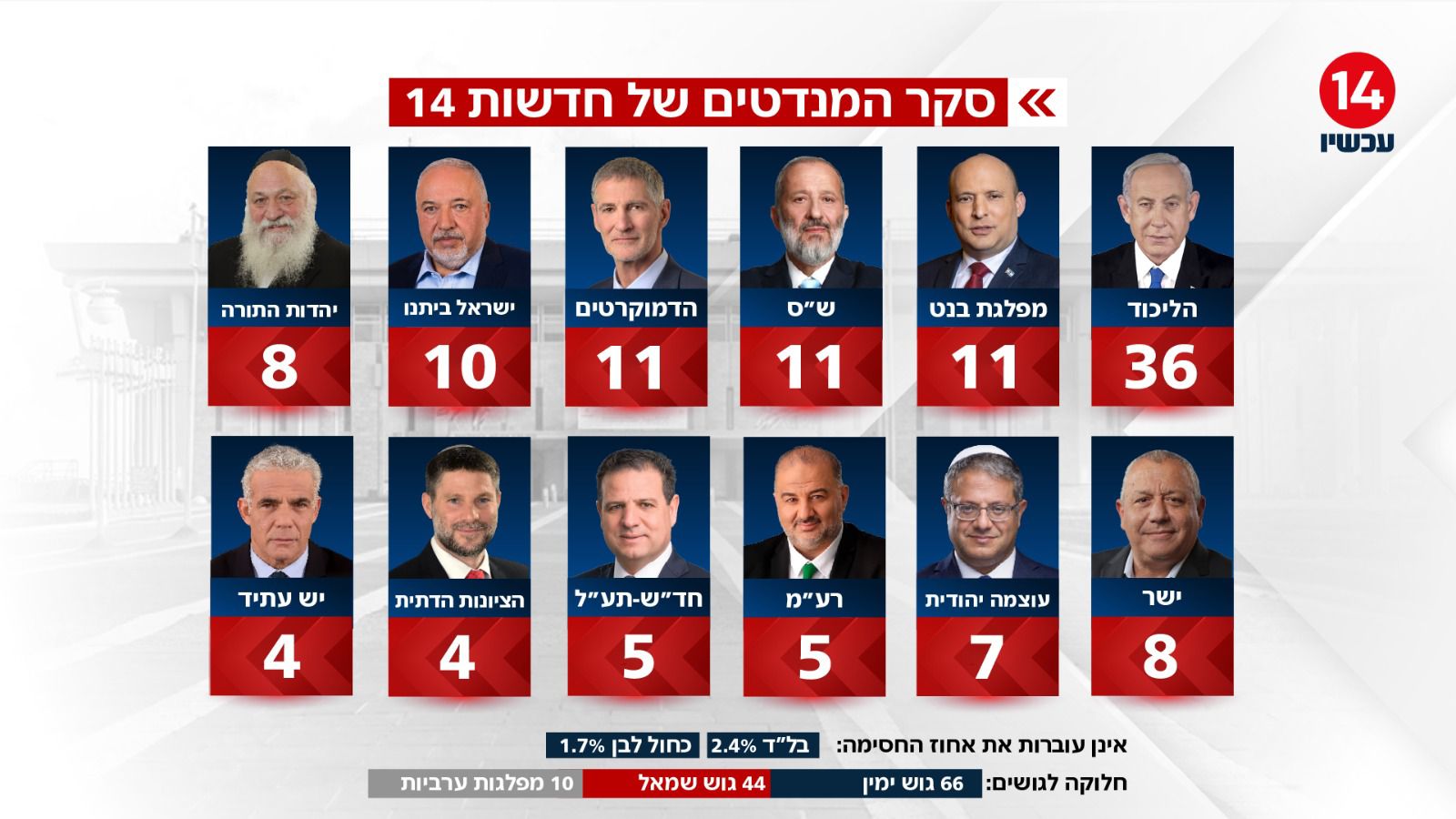 על פי תוצאות הסקר, חלוקת הגושים עומדת על גוש הימין עם 66 מנדטים, גוש השמאל עם 44 מנדטים, והמפלגות הערביות עם 10 מנדטים.