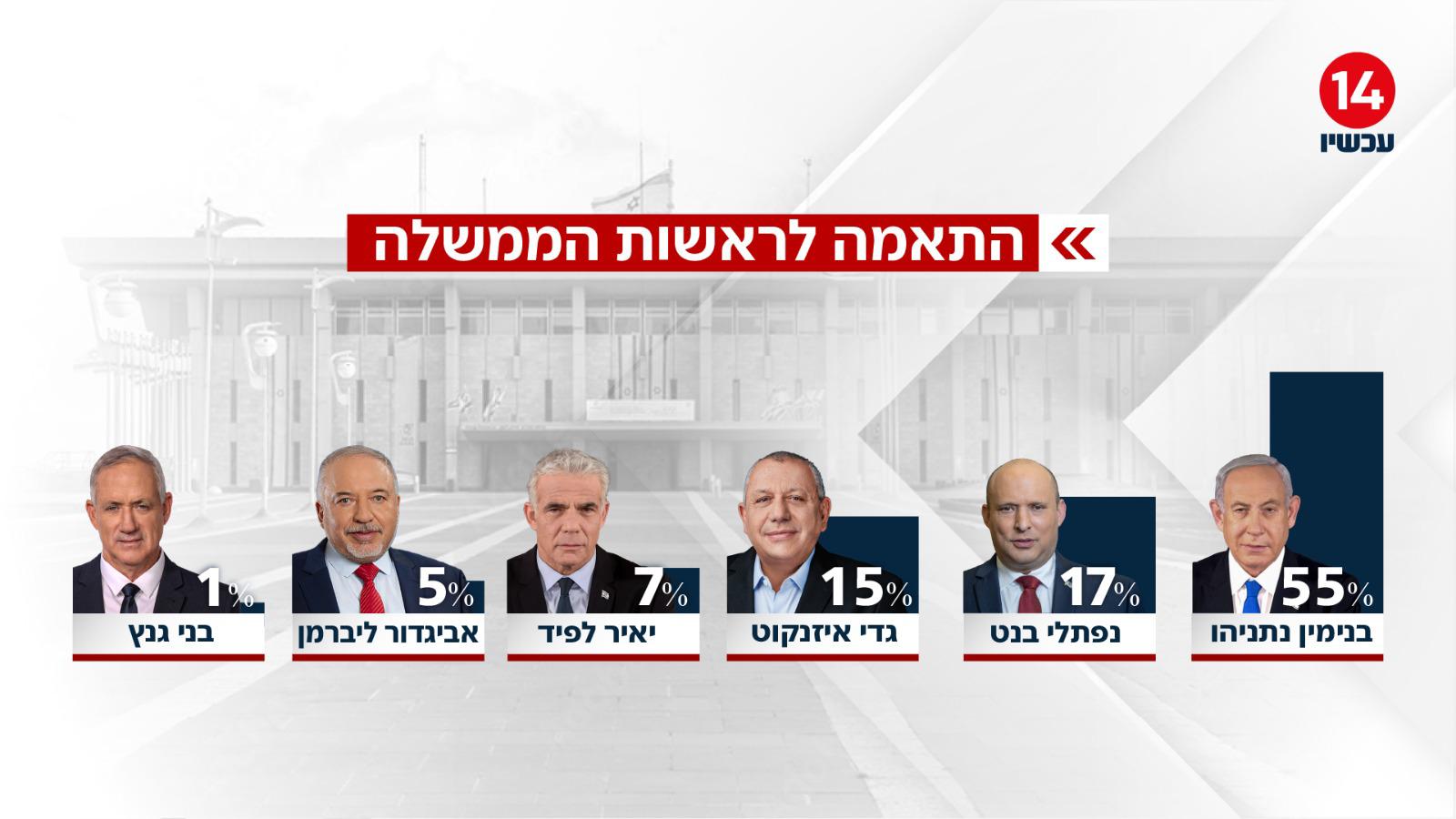 בשאלת ההתאמה לראשות הממשלה: בנימין נתניהו מוביל עם 55 אחוזים, אחריו נפתלי בנט עם 17 אחוזים, גדי איזנקוט עם 15 אחוזים, יאיר לפיד עם 7 אחוזים, אביגדור ליברמן עם 5 אחוזים ובני גנץ עם 1 אחוז.