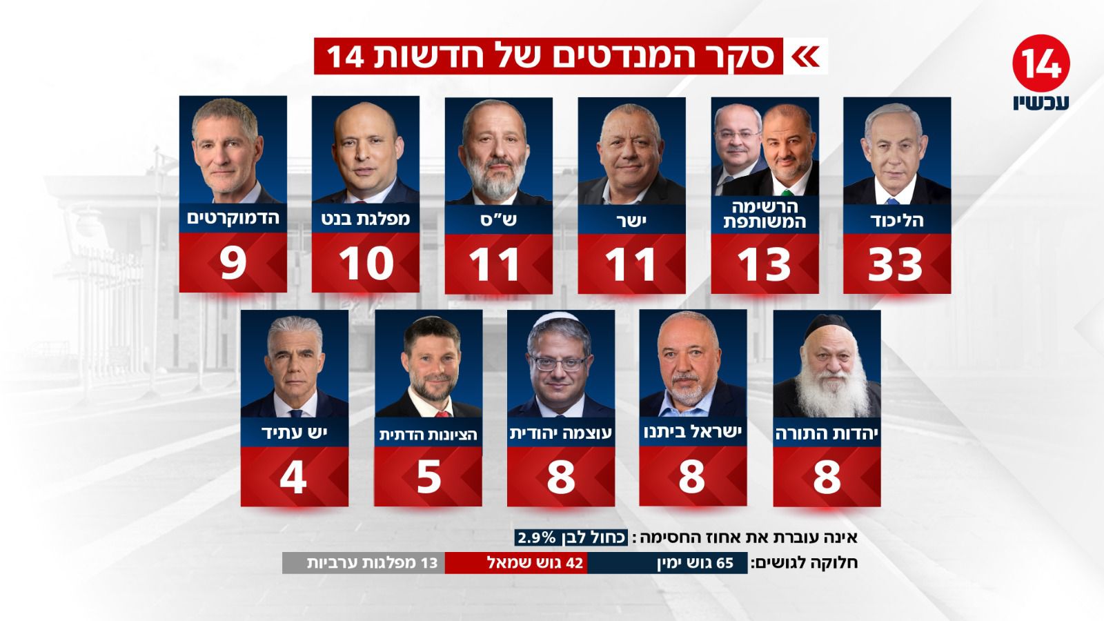 הליכוד במקום הראשון עם 33 מנדטים, אחריו הרשימה המשותפת עם 13 מנדטים, במקום השלישי ש״ס עם 11 מנדטים וכך גם ישר! של אייזנקוט עם 11 מנדטים. מפלגת בנט יורדת השבוע ל-10 מנדטים.