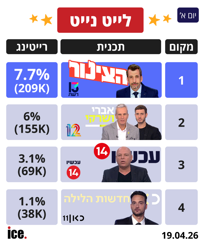 בגזרת תוכניות הלילה, תכנית "הצינור" של רשת 13 כבשה את פסגת הלייט נייט עם נתון חזק של 7.7% (209 אלף צופים), כשהיא מביסה את "אברי ושרקי" בקשת 12 שקיבלו 6.0%. ערוץ 14 רשם ברצועה זו 3.1%, וחדשות הלילה של כאן 11 חתמו את הערב עם 1.1% בלבד.