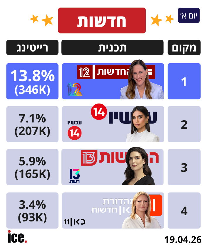 בגזרת החדשות, המגמה המוכרת נמשכת: חדשות 12 מובילה בבטחה עם 13.8% (346 אלף צופים). ההפתעה הגדולה נרשמה במקום השני שם ניצבת המהדורה של עכשיו 14 עם 7.1% (207 אלף צופים), כשהיא עוקפת באופן משמעותי את חדשות 13 שהסתפקה ב-5.9% בלבד (165 אלף צופים) בעוד המהדורה של כאן 11 סגרה את הרשימה עם 3.4% (93 אלף צופים).