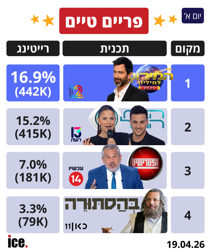 דירוג הרייטינג היומי של ICE: תוכנית הריאיליטי של קשת 12 "המירוץ למיליון" ממשיכה להוביל את הטבלאות עם כמות צופים שלא מביישת את הערוץ. האח הגדול מיד לאחר מכן והפטריוטים שעשו 7%
