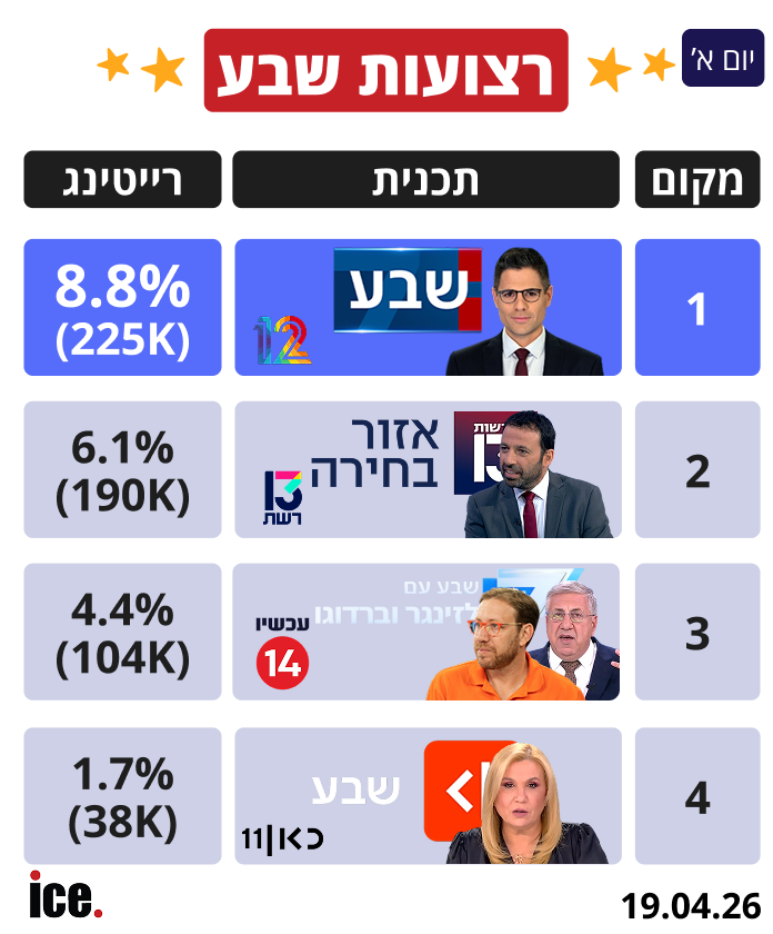 ברצועת השעה שבע: במקום הראשון קשת 12, כאשר "שבע עם גדעון אוקו" הגיעה ל-8.8%. במקום השני התייצבה התוכנית "אזור בחירה" של רשת 13 עם 6.1%, כשהיא מקדימה את "שבע עם שלזינגר וברדוגו" של ערוץ 14 שרשמה 4.4%. במקום האחרון ברצועה זו נמצאת איילה חסון בכאן 11 עם 1.7%.