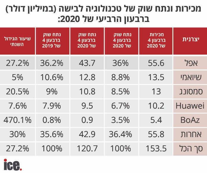 בפרספקטיבה שנתית, לאורך כל 2020 אפל שלחה 151.4 מיליון מכשירים לבישים, כשהיא חולשת על 34.1% מהשוק. שיאומי שהגיעה למקום השני גם הסיכום השנתי שלחה 50.7 מיליון מכשירים, יואי שבמקום השלישי שלחה 43.5 מיליון וסמסונג שלחה 40 מיליון.