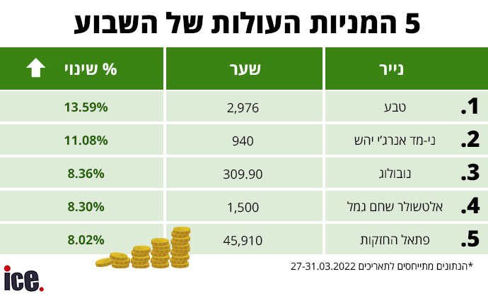 המדדים המרכזיים בבורסה ירדו השבוע בשיעורים זהים; יוחננוף ופוקס של הראל ויזל ירדו ב-10% בממוצע ואילו טבע זינקה בכמעט 14%