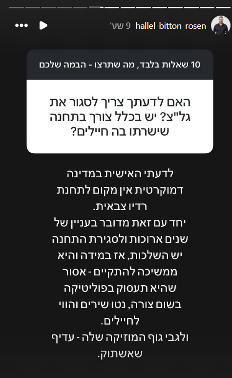 כתב ערוץ 14, הלל ביטון רוזן, מתייחס לכך בחשבון האינסטגרם שלו, וכותב מה דעתו על תחנת הרדיו הצבאית. בסטורי שהעלה כתב הלל ביטון רוזן כאשר נשאל על כך: "לדעתי האישית במדינה דמוקרטית אין מקום לתחנת רדיו צבאית. יחד עם זאת מדובר בעניין של שנים ארוכות ולסגירת התחנה יש השלכות, אז במידה והיא ממשיכה להתקיים - אסור שהיא תעסוק בפוליטיקה בשום צורה, נטו שירים והווי לחיילים. ולגבי גוף המוזיקה שלה - עדיף שאשתוק".