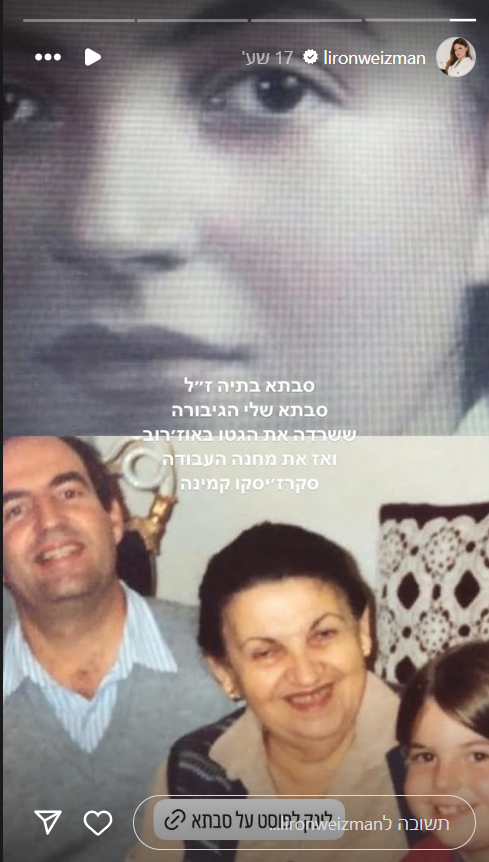 סבתא של לירון ויצמן, בתיה, שרדה 5 שנים שלמות של שואה: "סבתא שלי הגיבורה ששרדה את הגטו באוז'רוב ואז את מחנה העבודה סקרז'יסקו קמינה".