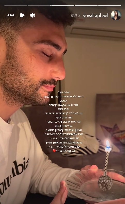 בברכה שפרסמה יובל רפאל בסטורי שלה היא כתבה: "אהבה שלי, ביום הלא פשוט הזה יש נקודת אור קטנה. ואני יודעת שקשה לך היום, ובכל זאת אני מאחלת לך אושר אושר ואושר ועוד פעם אושר. ובריאות אהבה שלי כל השאר בחיים זה בונוס. ואמןןן ויגיעו אלייך מיליון בונוסים. אבל את המהות של החיים האלה אל תשכח לעולם, שתהיה מושרשת בך ותלווה אותך תמיד. שרק תהיה לי מאושר ובריא. אני אוהבת אותך".