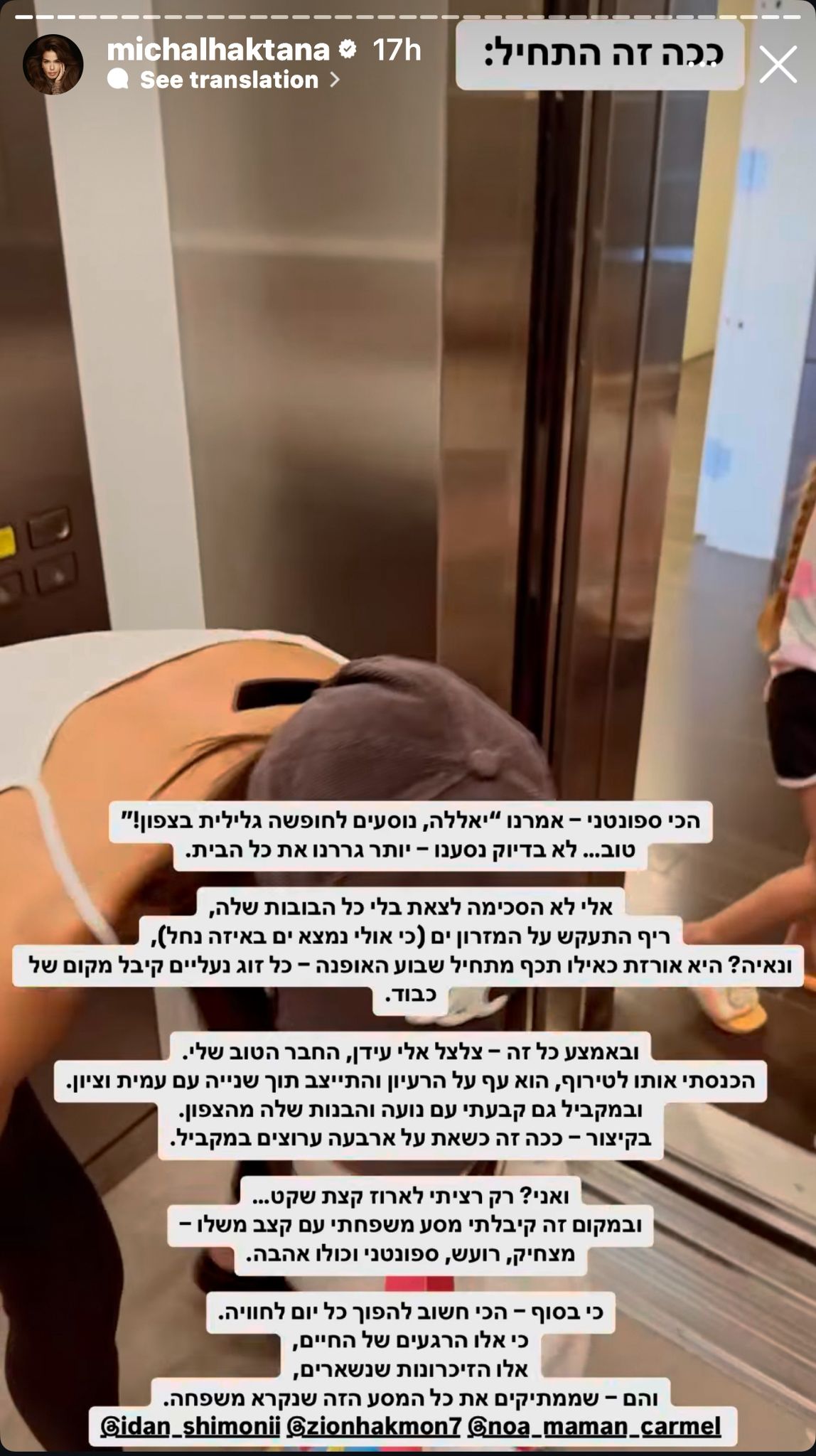 כך כתבה: "הכי ספונטני, אמרנו 'יאללה, נוסעים לחופשה גלילית בצפון!' טוב… לא בדיוק נסענו, יותר גררנו את כל הבית. אלי לא הסכימה לצאת בלי כל הבובות שלה, ריף התעקש על מזרון ים (כי אולי נמצא ים באיזה נחל), ונאיה? היא אורזת כאילו תכף מתחיל שבוע האופנה – כל זוג נעליים קיבל מקום של כבוד.
