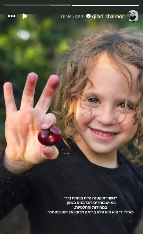 "כשהיית קטנה היית בוחרת בידי כמו שבוחרים דובדבנים בשוק. במהירות והחלטיות. כאילו ידי היא פלא בריאה אדום ואין יפה כמותה", שיתף שלמור בחשבון האינסטגרם שלו.