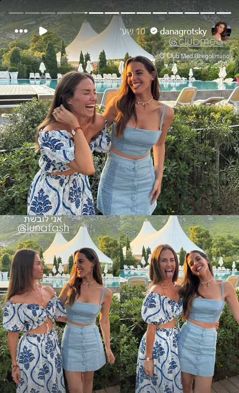 דנה גרוצקי, מגישת "ערב טוב עם גיא פינס" בקשת 12, חשפה גם כי קיבלה מהמלון תלבושת מותאמת לכבוד האירועים שיתקיימו בכפר הנופש. אבל לפני שהם יתחילו האורחים התבקשו להגיע לארוחת הערב הראשונה עם קוד לבוש בכחול לבן, וגם הגיעו הראל וגרוצקי, שגם תיעדו את המפגש שלהן.