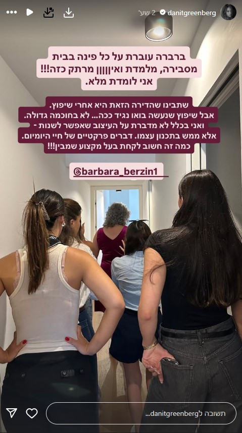 לצורך עיצוב הבית, הידוענית נעזרה במעצבת הפנים ברברה ברזין, אשר שימשה כשופטת בתוכנית הריאליטי "הבלוק" של ערוץ 10 בשנת 2019. גרינברג תיעדה את הגעתה של מעצבת הפנים המפורסמת לביתה החדש וסיפרה על התובנות שקיבלה בעקבות ביקורה: "פגישה ראשונה בדירה החדשה.