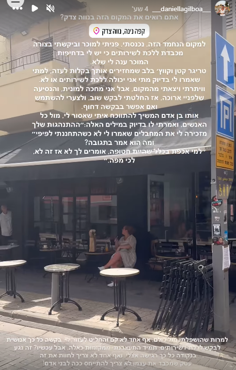 בסטורי נוסף הדגישה גלבוע: "מדובר בבית הקפה נינה בנווה צדק, לבעלים של המקום קוראים אייל והרחוב נמצא בשבזי 29 בתל אביב".